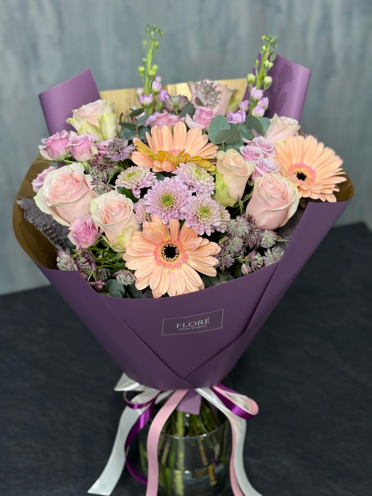 Švelni ir elegantiška, sudaryta iš harmoningai derančių šviesių atspalvių gėlių. S dydžio puokštė susideda iš 3–5 pagrindinių žiedų, kitų papildančiųjų žiedų bei sezoninės žalumos. Nuotrauka yra iliustracinė. Gėlių rūšys ir atspalviai gali skirtis, priklausomai nuo sezoniškumo ir dienos asortimento.