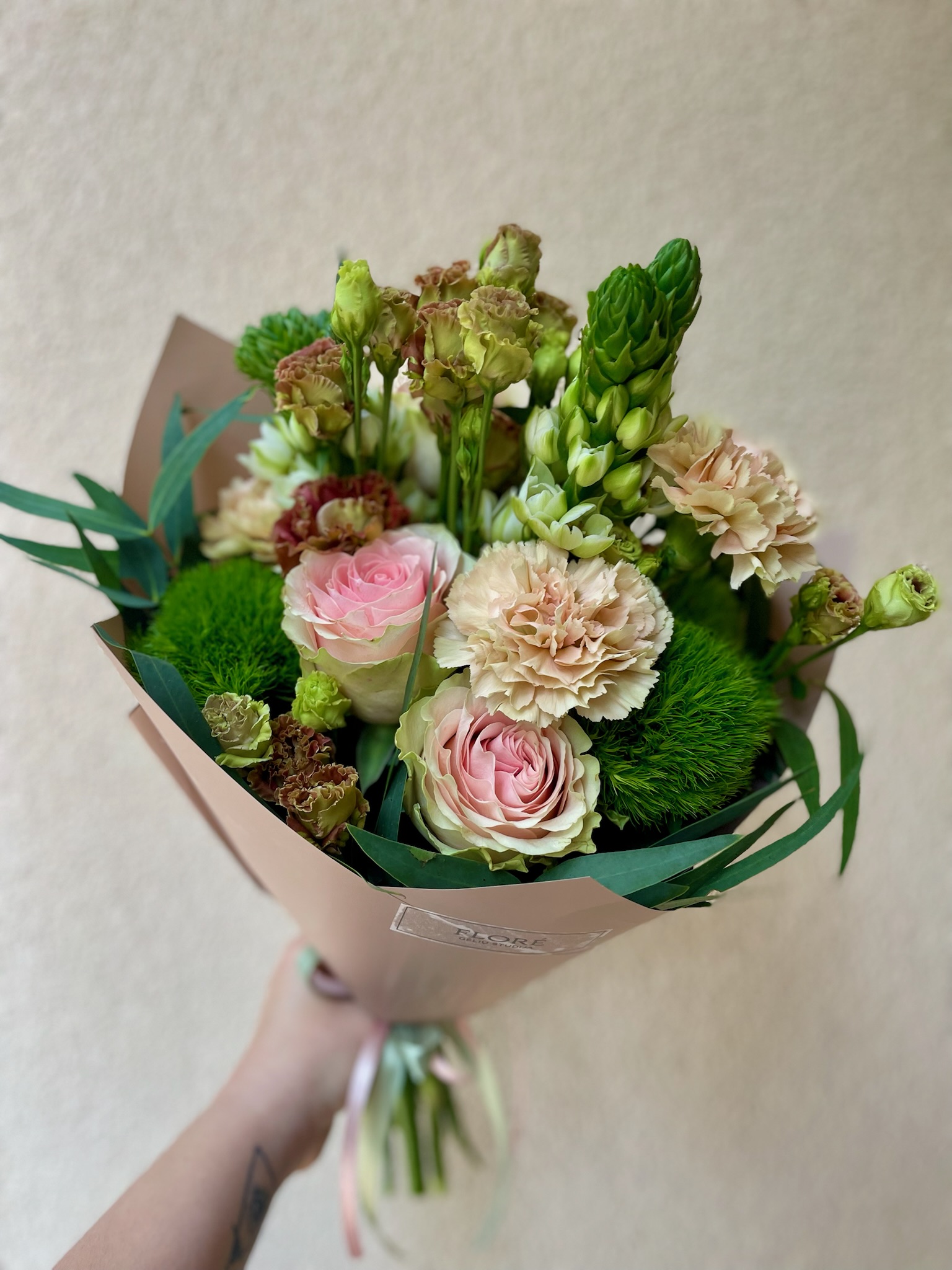 Gaivi, sudaryta iš harmoningai derančių šviesių atspalvių gėlių. S dydžio puokštė susideda iš 3-5 pagrindinių žiedų, kitų papildančiųjų žiedų bei sezoninės žalumos. Nuotrauka yra iliustracinė.Gėlių rūšys ir astpalviai gali skirtis, priklausomai nuo sezoniškumo ir dienos asortimento.